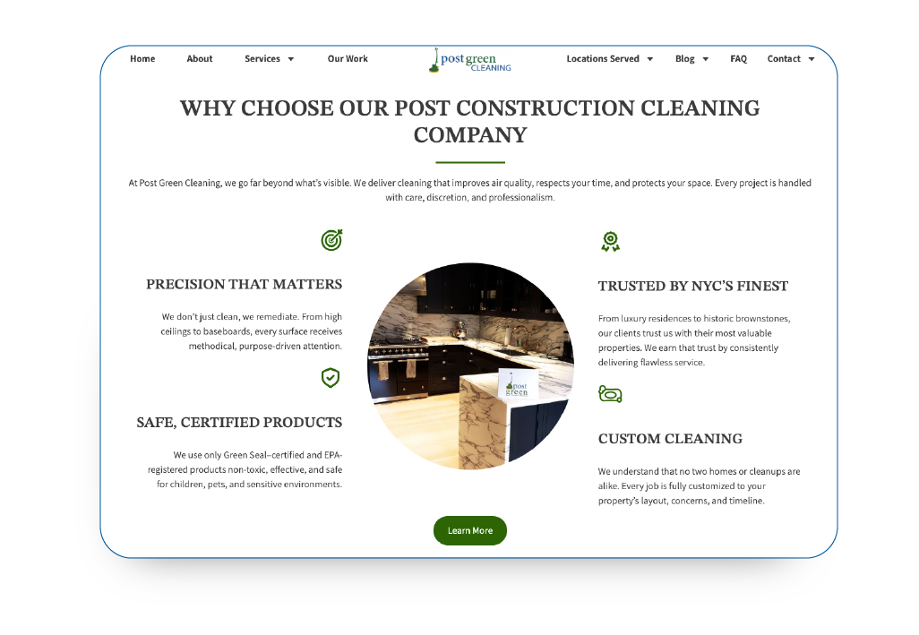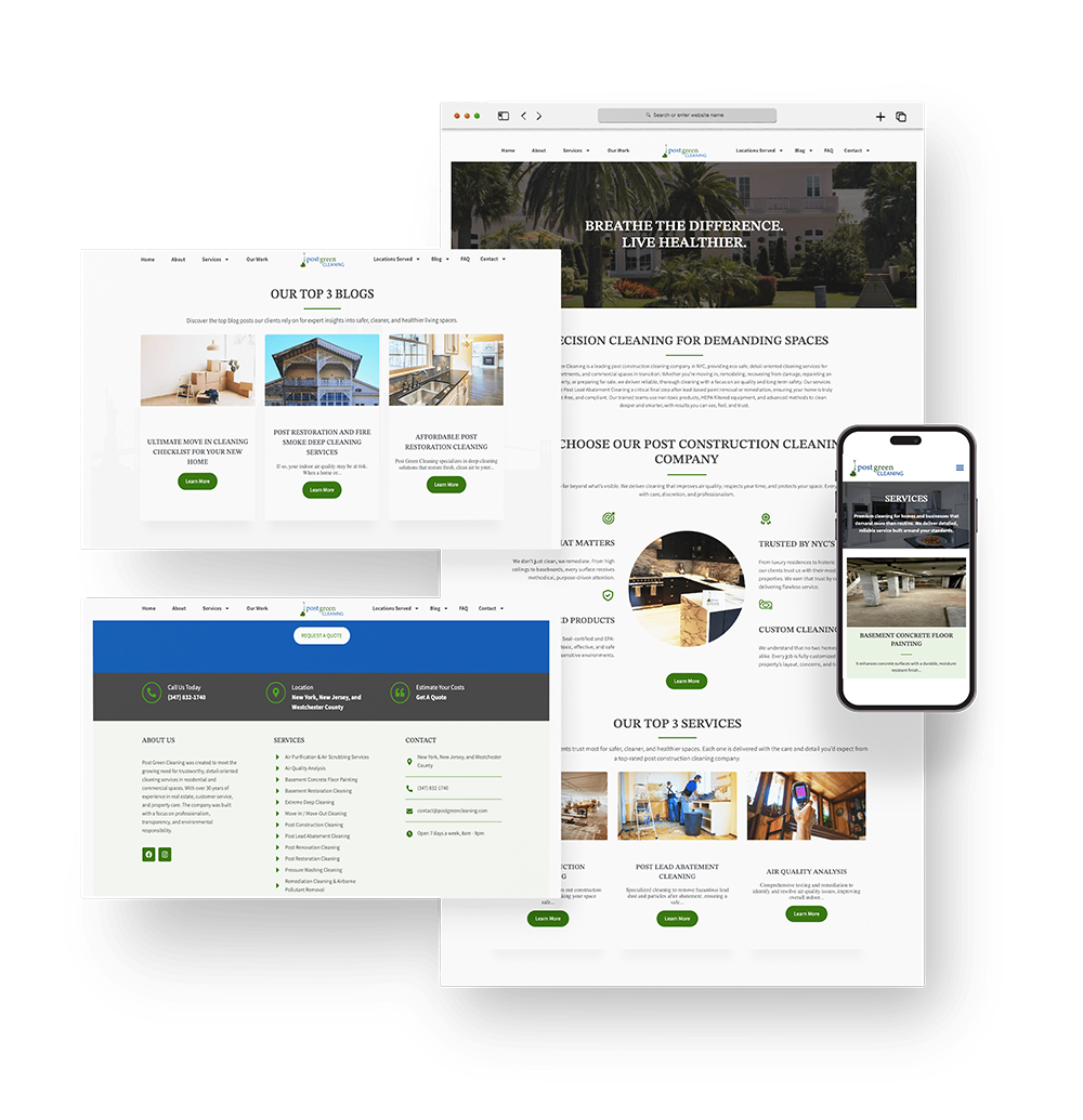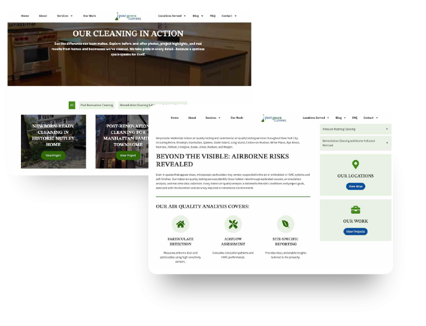 Post Green Cleaning is a New York company specializing in post-construction, post-renovation, and lead abatement cleaning for high-end properties. We rebuilt their website with an SEO-focused strategy to improve visibility, attract clients, and highlight their expertise in eco-safe, detail-oriented transition cleaning.